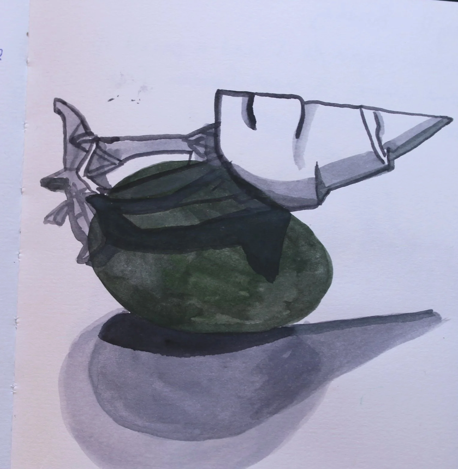 Diary: I am finding it impossible to write down my experience, for some reason However, I have found that if I do a small painting/ illustrations on one side of a double page in my sketchbook, then this allows myself to write on the other side that faces the painting. I’ve never been a writer, but I have been a painter, in my deep past.