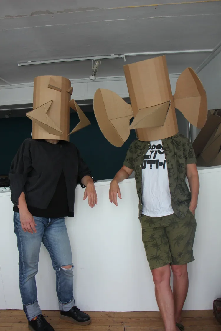 Previous experiments with cardboard have been The Geometrically Rude Helmets which were to be worn in cafes to enable nosiness. Watts & Dad won the Clare Thornton Memorial Artist’s Residency at Looe Street (2022) and the photograph below shows some of their cardboard experiments.